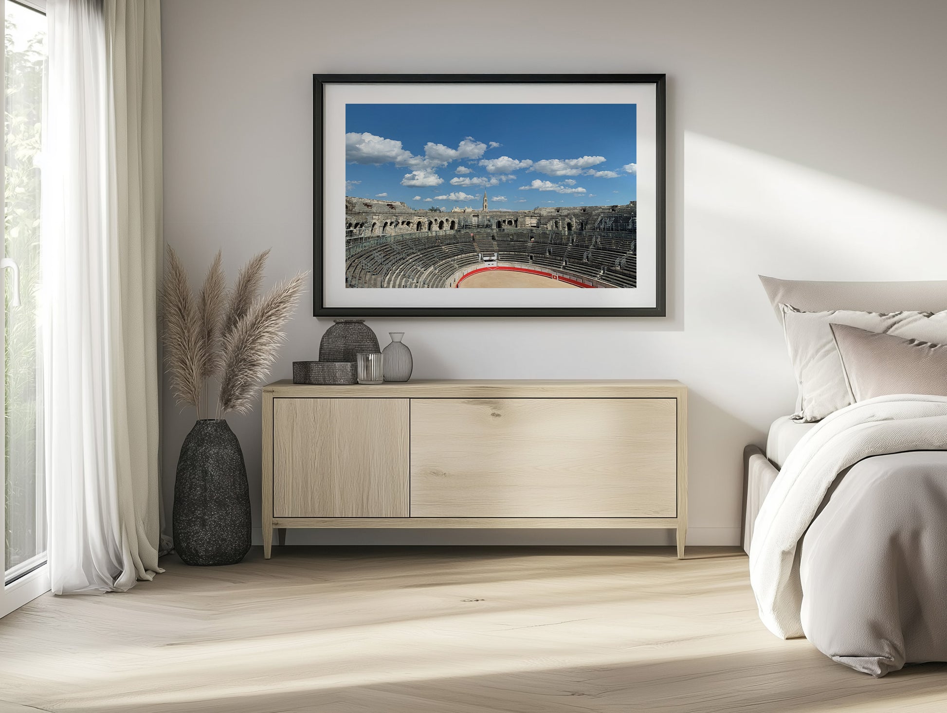 Soft golden light falls over the ancient stone arches of the Nîmes Amphitheatre, blending history and stillness in one timeless scene. The gentle warmth and texture make this photograph perfect for those drawn to old-world architecture and quiet beauty. Ideal for living rooms, studies, or modern gallery walls, this piece adds depth and a touch of European charm to any space.