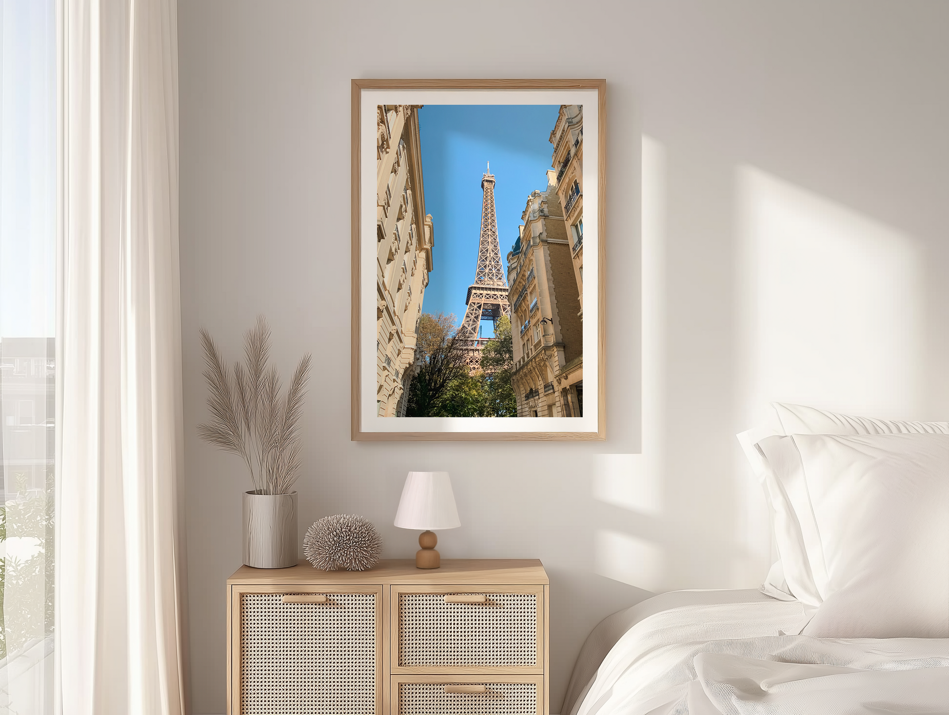 A subtle glimpse of the Eiffel Tower framed by Parisian streets — this photograph captures the romance of everyday moments in the City of Light. Soft tones and elegant composition make it ideal for minimalist décor and travel-inspired walls. Perfect for bedrooms, entryways, or studios, this piece brings gentle sophistication to any setting.