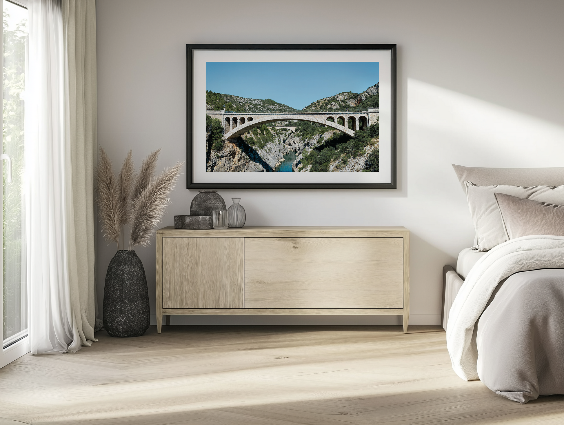 Rustic stone arches cross still blue water in this photograph of the Pont du Diable. A blend of natural calm and historic detail, it evokes both serenity and strength.